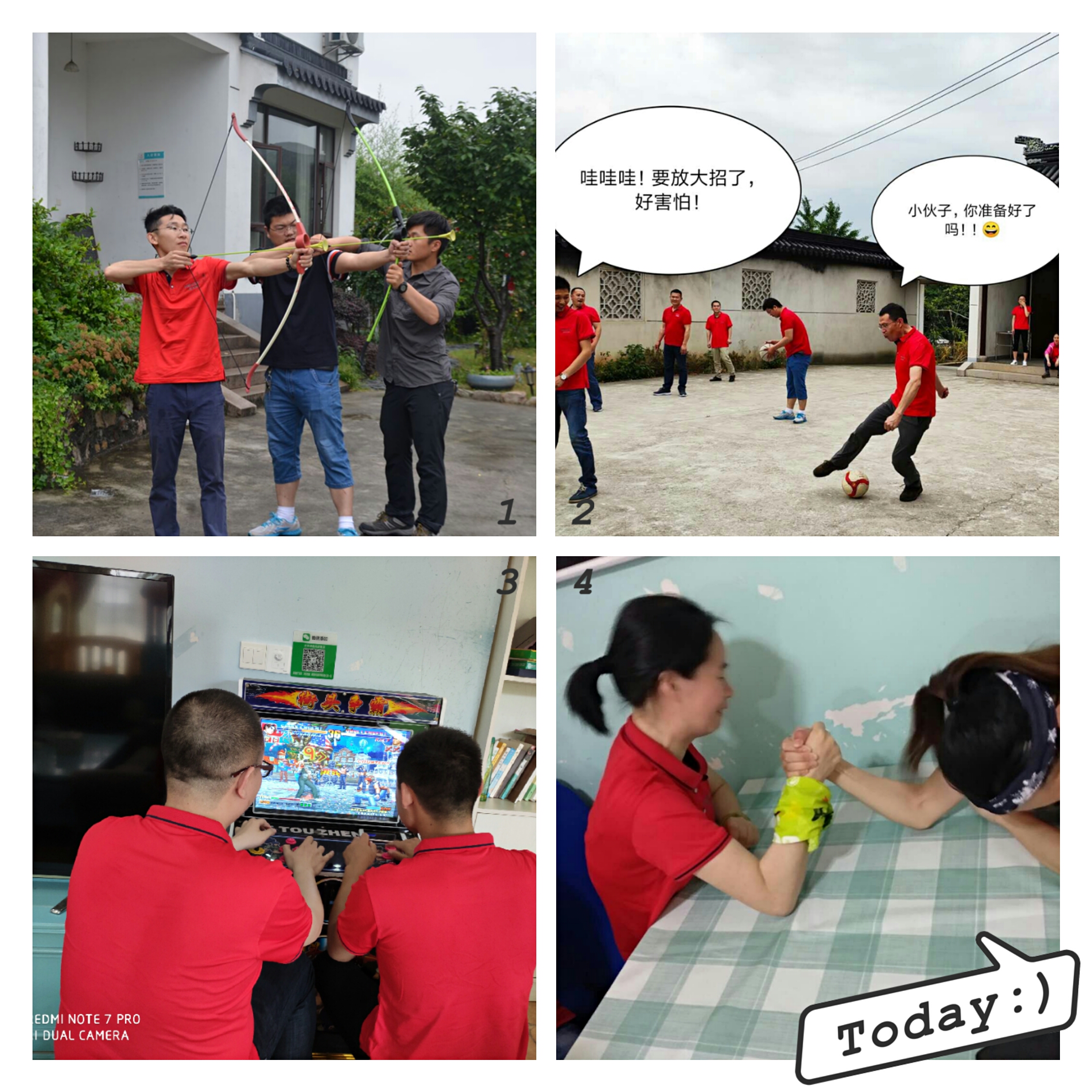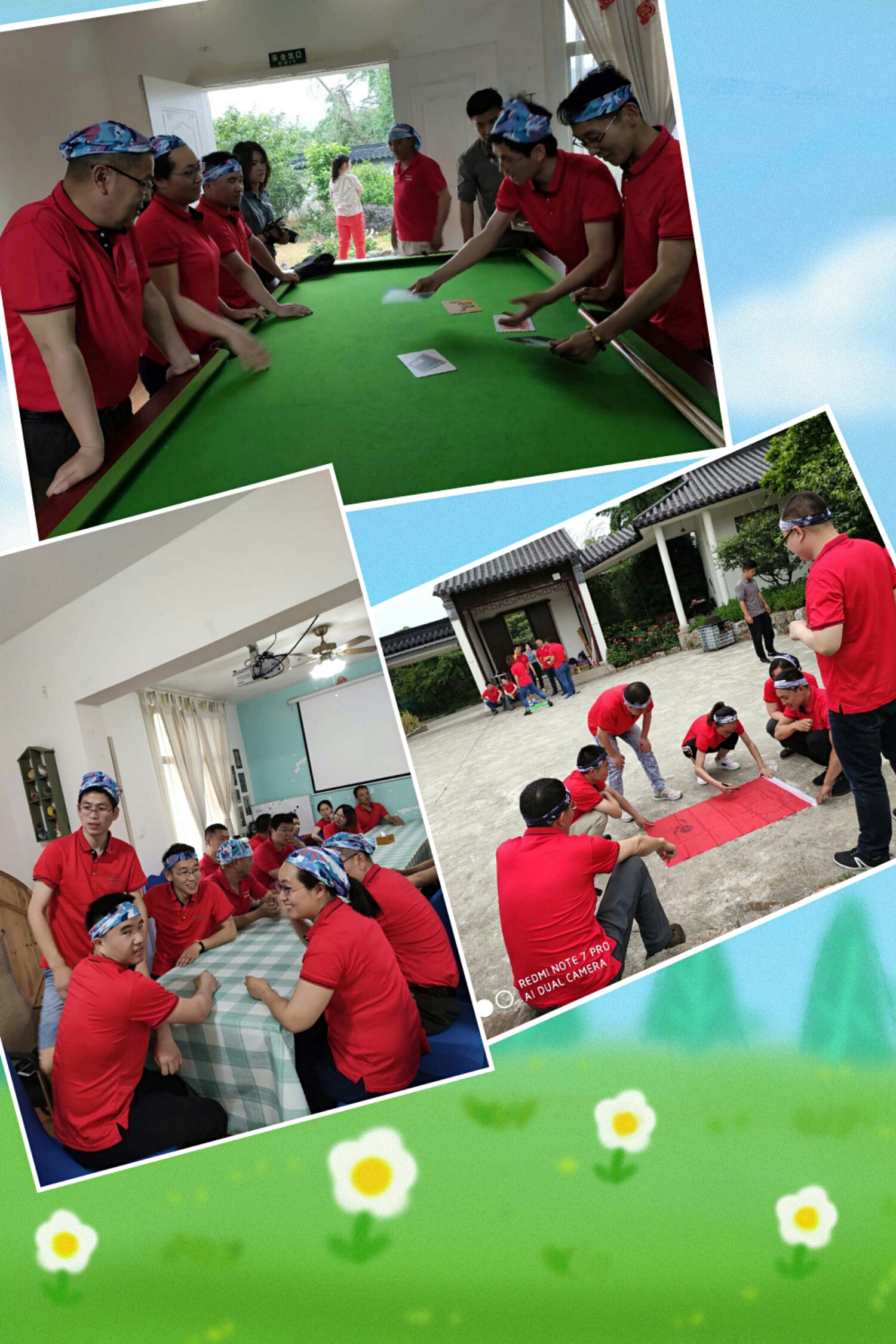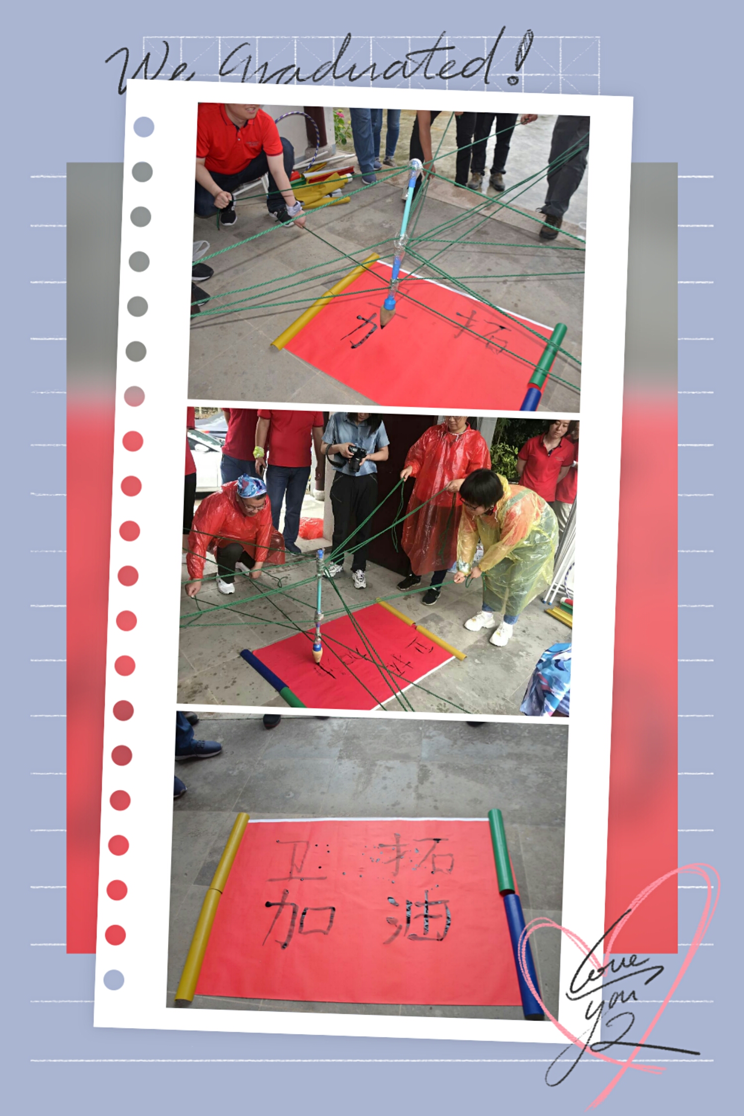 要說印象最深刻的就是“神筆馬良”了,所有隊員拉繩子的末端,在不接觸毛筆的情況下在紅色紙上寫出“衛(wèi)拓加油”四個大字,這個游戲就是要求所有隊員勁往一處使,為了小組在比賽中能夠獲勝,每個人拉著手中的繩子,跟著其他隊員的力氣努力的勾出一撇一捺,最后一起寫出“加油”的時候所有組員都覺得特別開心自豪,這個時候結(jié)果已經(jīng)不那么重要,我們一起完成了。
